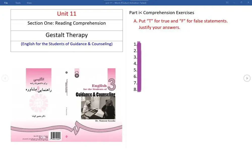 پاسخ تمرین Unit 11 کتاب (English for the Students of Guidance & Counseling) (درس یازدهم: Gestalt Therapy)<(10 اسلاید)–(تایپ شده و مرتب)–(فرمت فایل DOC)