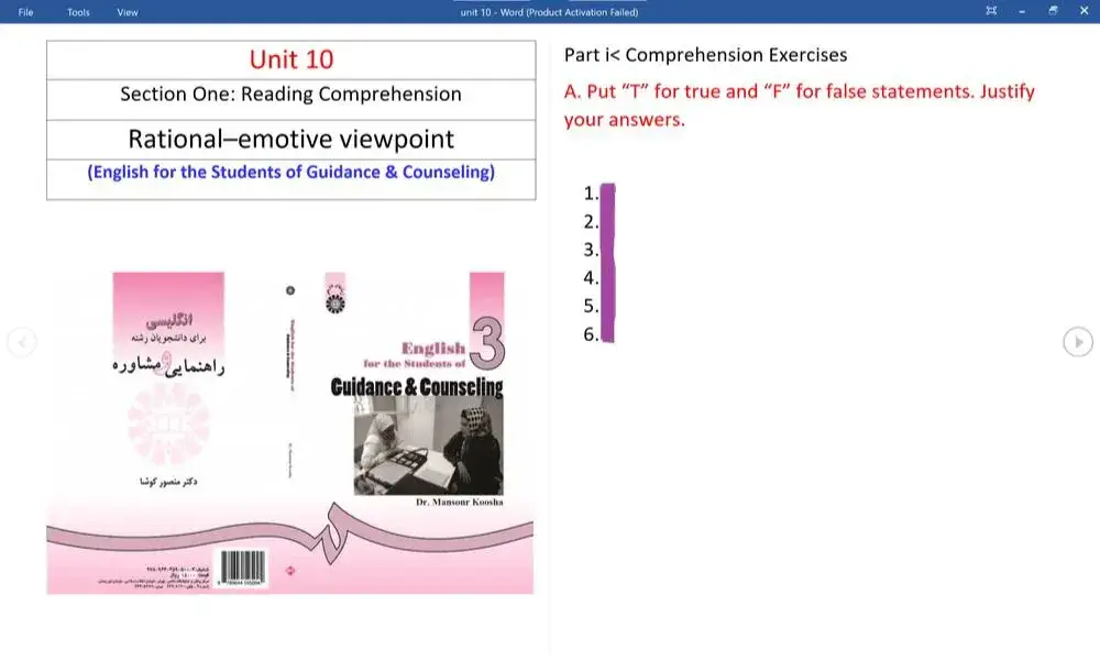 پاسخ تمرین Unit 10 کتاب (English for the Students of Guidance & Counseling) (درس دهم: Rational-emotive Viewpoint)<(10 اسلاید)–(تایپ شده)–(فرمت فایل DOC)