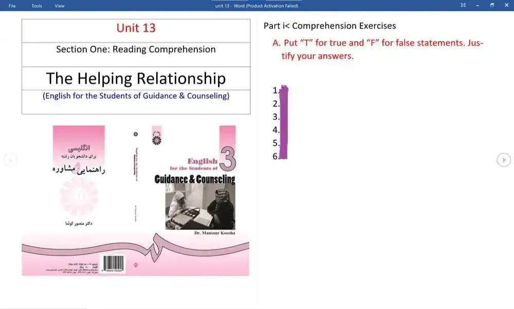 پاسخ تمرین Unit 13 کتاب (English for the Students of Guidance & Counseling) (درس سیزدهم: The Helping Relationship)<(10 اسلاید)–(تایپ شده)–(فرمت فایل DOC)