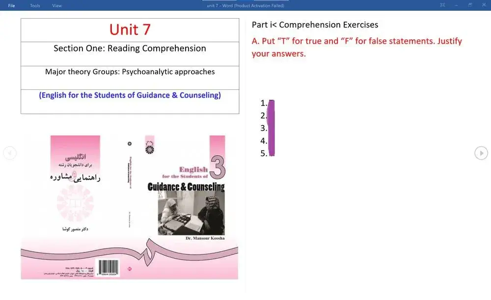 پاسخ تمرین Unit 7 کتاب (English for the Students of Guidance & Counseling) (درس هفتم: Major Theory Groups: Psychoanalytic Approaches)<فرمت فایل DOC